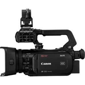 The Canon XA75 Professional UHD 4K Camcorder is a compact, lightweight camera featuring UHD 4K capture, a 1″ CMOS sensor, two XLR audio inputs, and one each mini-HDMI and BNC 3G-SDI output, which fits right into the ENG category for documentary or journalism-style productions. Updated from its XA55 predecessor, this model features a larger 3.5mm LCD capacitive touchscreen display, a higher resolution tiltable 0.36″ OLED EVF, OSD metadata recording, and fast USB Type-C video-only output with UVC support for livestreaming to a computer.