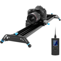 The 32″ GVM Professional Video Aluminum Alloy Motorized Camera Slider features an 11-pound horizontal load capacity as well as a 30″ slider range, but that is just the tip of its capabilities. It has an attached controller that enables you to select and control the start/stop positions of the slider along the track, as well as selecting between video and still photo mode. The aluminum rail bed features an adjustable channel that allows you to shoot straight (perpendicular to the track rails) in a parabola to keep a subject centered as the camera tracks from side to side, or it can create a 120° panoramic camera move.